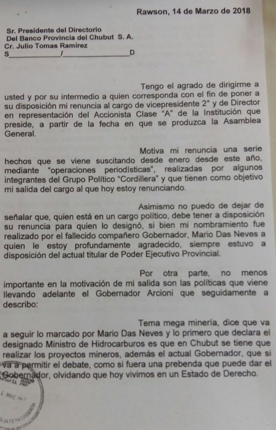 #EQSnotas accedió a la carta de renuncia en la que apuntó a las políticas del gobernador Mariano Arcioni y a “operaciones periodísticas”, realizadas por algunos integrantes del Grupo Político Cordillera” y que tienen como objetivo mi salida del cargo al que hoy estoy renunciando”. versa el documento.