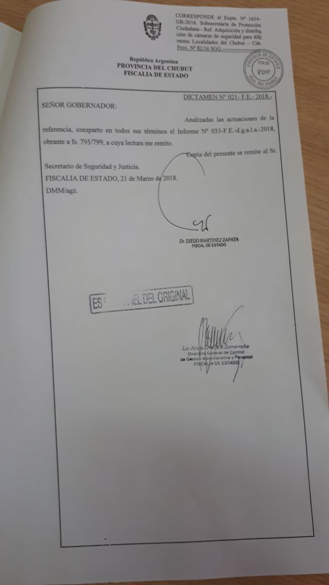 La Fiscalía de Estado respaldó la denuncia que hizo el secretario de Seguridad, Federico Massoni, ante la Procuración General por supuestos «sobreprecios» en la compra de cámaras de seguridad para los Centros de Monitoreo de Trelew, Rawson, Esquel, Puerto Madryn y Comodoro Rivadavia.