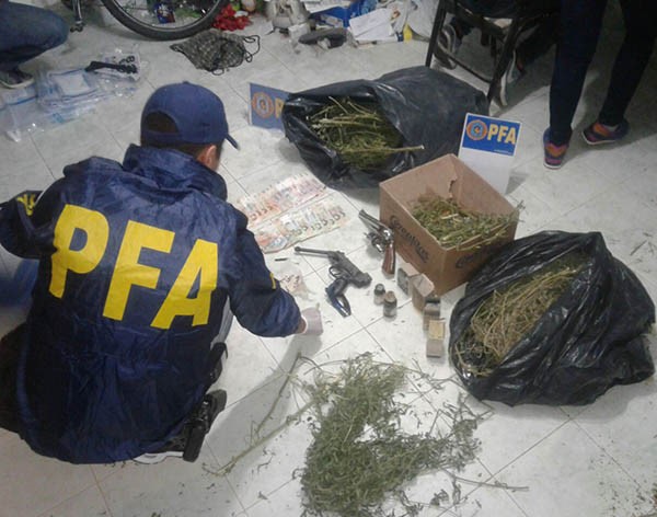 Al momento del arribo del personal policial el sujeto tenía en su poder gran cantidad de plantas de importantes proporciones que por la contextura y olor pudieron establecer que se trata de una variedad de cannabis sativa, además de un arma de guerra, marihuana compactada lista para su comercialización, cinco frascos con una cuantía significativa de semillas de dicha planta y efectivo de baja denominación.