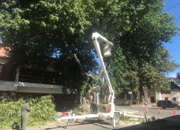 La Secretaría de Ambiente comenzó los trabajos de poda y extracción de árboles de altura con una guía que cedió especialmente Vialidad Provincial debido a que el municipio no cuenta con la maquinaria adecuada para ejemplares muy altos.