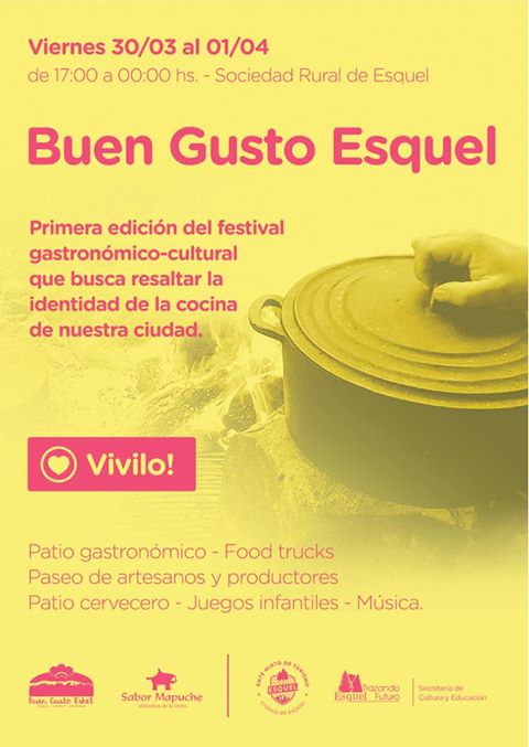 Durante los días 30, 31 de marzo y 1 de abril, de 17 a 24 horas, se desarrollará en el predio de la Sociedad Rural la primera edición del festival gastronómico-cultural “Buen Gusto Esquel” que, busca resaltar la identidad de la cocina de nuestra ciudad. El evento es organizado por Sabor Mapuche y cuenta con el auspicio de la Municipalidad de Esquel a través de las secretarías de Cultura y Educación, y de Turismo.