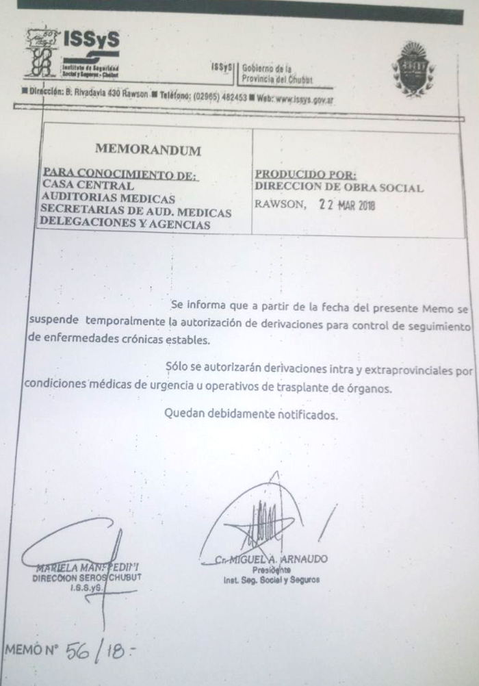 En el memorándum 56/18, el Instituto de Seguridad Social y Seguros además informa que “sólo se a autorizarán las derivaciones intra y extraprovinciales por condiciones médicas de urgencia u operativos de trasplante de órganos”.