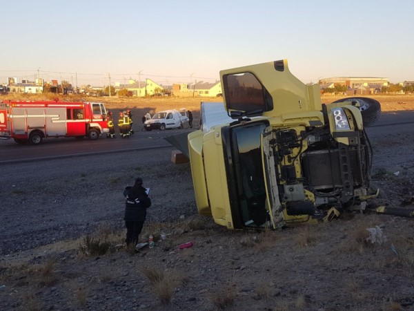 Un camión repleto de artículos electrónicos que circulaba desde Tierra del Fuego hacia Buenos Aires, volcó este domingo a primera en Trelew tras chocar con otro vehículo sobre la Ruta 3, a la altura del Basural.