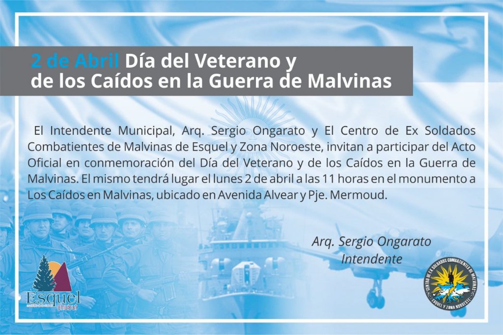 Será a las 11hs en Av Alvear y Pje Mermoud, donde se encuentra el monumento en el Barrio Malvinas. Estarán presentes los ex combatientes, acompañados por el Intendente de Esquel Sergio Ongarato.