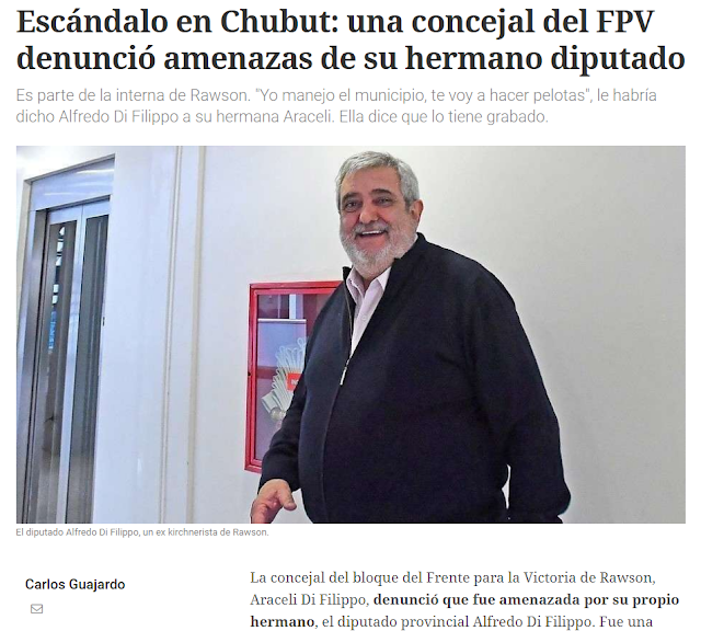 El Diputado Alfredo Di Filippo muy cobardemente amenazó a su propia hermana gritándole «Yo manejo el municipio, te voy a hacer pelotas» haciendo referencia al municipio de Rawson que en sus vagos pensamientos pensaba que manejada. Parece que el «Peludo» todavía no se topo con la «horma de su zapato» puesto que las amenazas de este personaje son constantes. Pronto encontrará la horma.