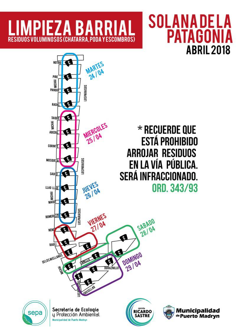 La campaña de recolección de residuos voluminosos continuará durante esta semana en el barrio Solana de la Patagonia. Desde hoy hasta el domingo 29 de abril se colocarán contenedores en distintas calles para que los vecinos puedan depositar restos de poda, chatarra y escombros. Según el cronograma, permanecen una jornada en cada sector y el operativo de traslado se realiza entre las 13 y las 17 horas de cada día. Además, se realizan actividades de concientización sobre la temática.