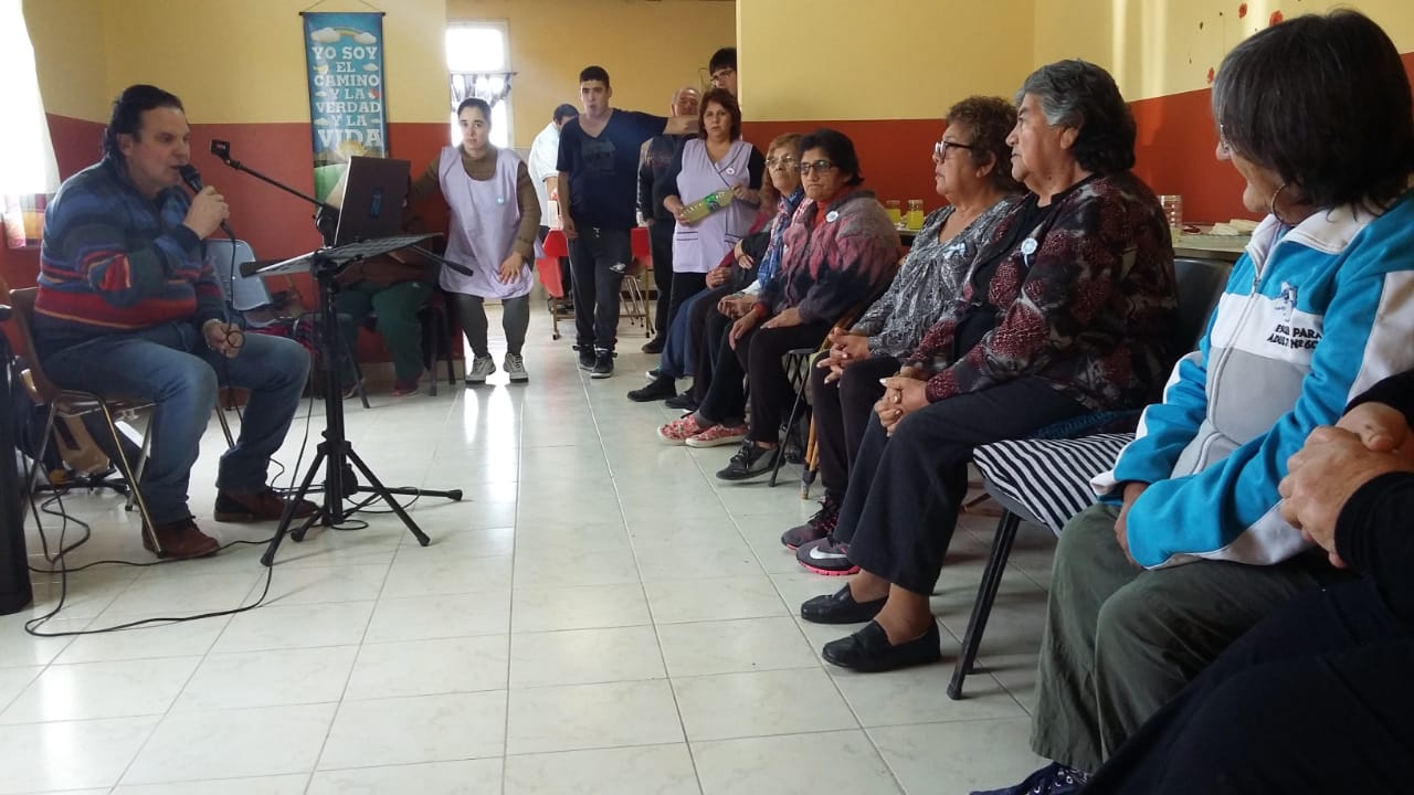 Los 25 adultos mayores que asisten a la institución compartieron un almuerzo de pizzas con tortas de crema de postre. Luego el artista Pedro “Chispa” Ochoa brindó un repertorio de tango y temas nacionales.