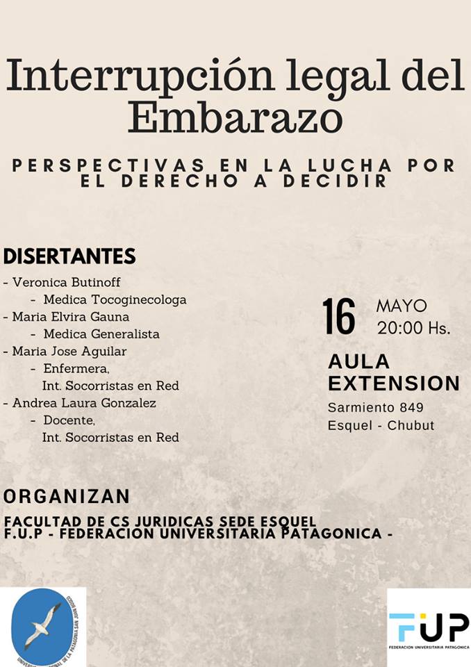 Este miércoles 16 de Mayo a las 20 horas dará comienzo una charla abierta organizada por la Facultad de Ciencias Jurídicas de la Sede Esquel de la UNPSJB y la Federación Universitaria Patagónica. En la misma se tratará acerca de la «Interrupción Legal del Embarazo», y en la oportunidad realizarán la exposición la Dra Verónica Butinoff (Tocoginecologa), la Dra Elvira Gauna (Médica Generalista), la enfermera María José Aguilar y la docente Andrea González.
