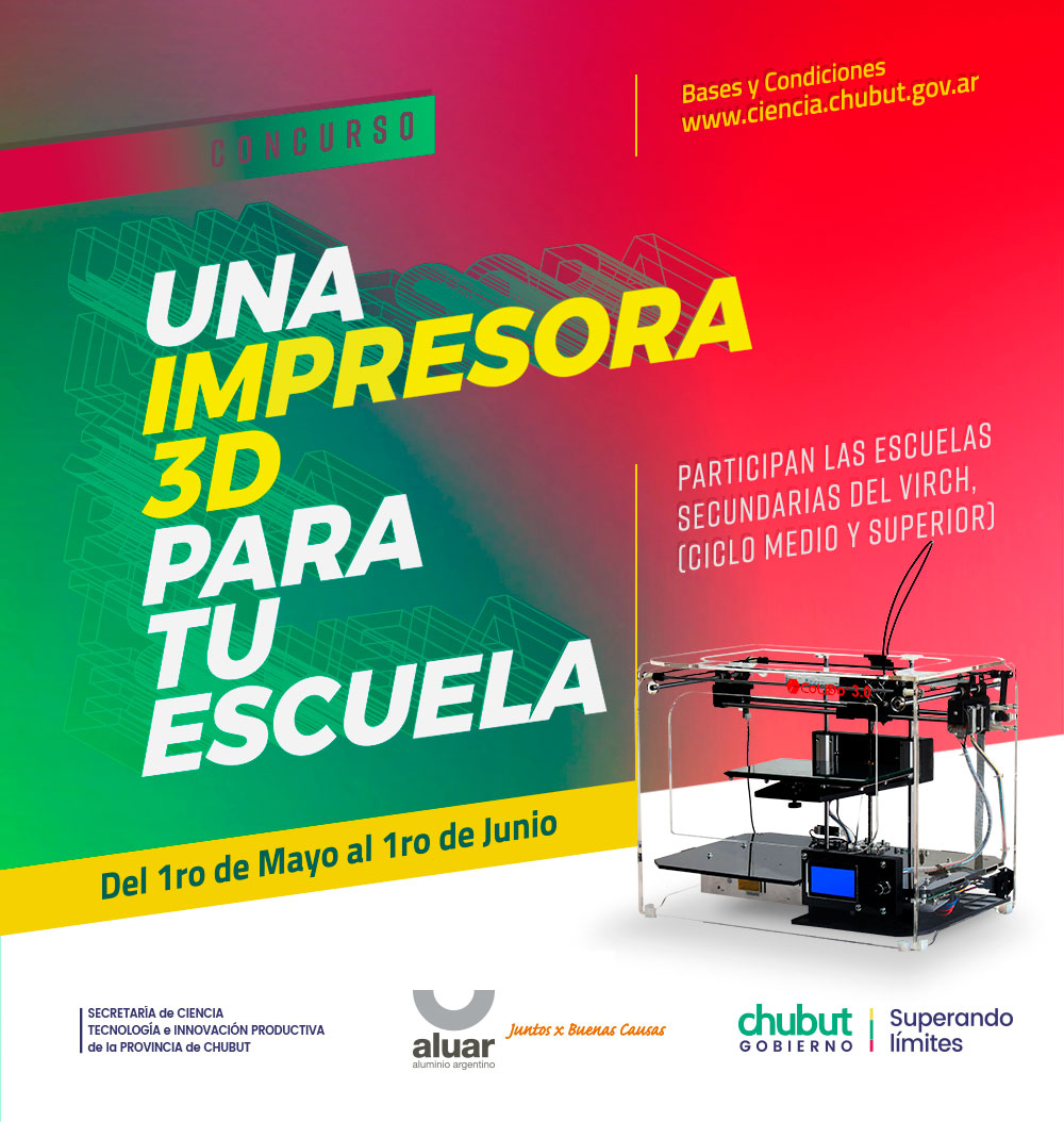 La Secretaría de Ciencia Tecnología e Innovación Productiva del Chubut junto a ALUAR, y en el marco del proyecto Juntos por Buenas Causas, lanza el concurso «Una impresora 3D para tu Escuela», destinado a promover el uso de la impresión 3D como proyecto educativo institucional, generando proyectos innovadores y con compromiso social.