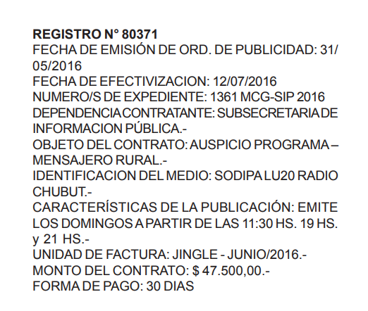 El Mensajero Rural recibió 15 contratos de «Auspicios» de publicidad por $ 711.000 pesos, y tanto en este servicio a la sociedad como en el programa Redacción 20, ninguna de las personas consultadas recuerda haber escuchado alguna vez que se mencione que se cuenta con el «Auspicio» del gobierno.