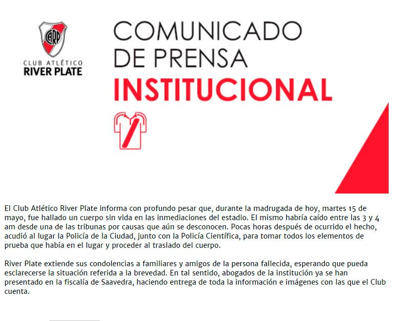 El club de Núñez informó en un comunicado que «durante la madrugada de hoy, martes 15 de mayo, fue hallado un cuerpo sin vida en las inmediaciones del estadio», en tanto la Justicia investiga el tema.