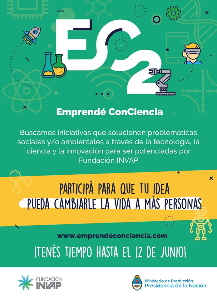 El Centro de Apoyo a la Producción (CAPEC) de la Municipalidad de Esquel, informa que hasta el 12 de Junio se encuentra abierta la convocatoria para la segunda edición Emprendé ConCiencia 2018 a partir de la iniciativa del Ministerio de Producción y Fundación INVAP orientada a emprendedores y emprendedoras científico tecnológicos con impacto social y/o ambiental.