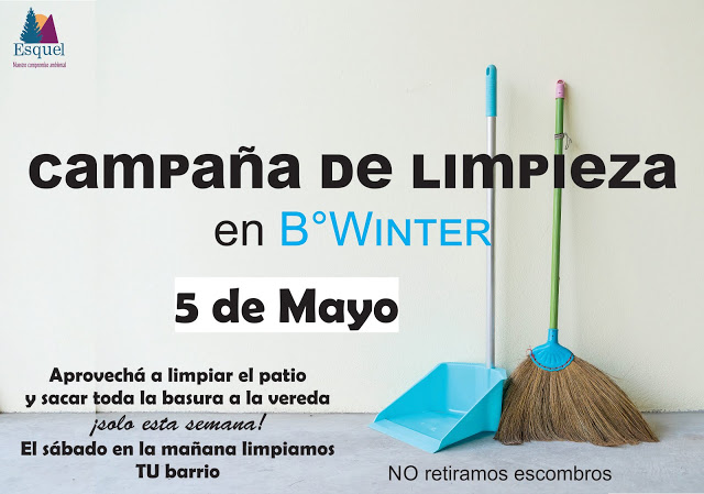 La Secretaría de Ambiente de la Municipalidad de Esquel informa que este sábado 5 de Mayo se realizará una campaña de limpieza en el barrio Winter. A partir de las 7 horas, se retirará chatarra, muebles viejos y objetos en desuso de grandes dimensiones.