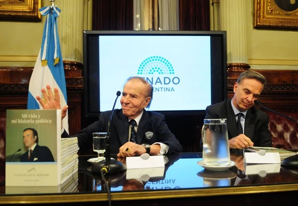 El senador peronista por La Rioja y ex presidente de la Nación, Carlos Menem, presentó hoy un libro autobiográfico durante una ceremonia en la que recordó anécdotas de su vida, bromeó sobre la muerte y propuso a Miguel Angel Pichetto, jefe del bloque Justicialista en la cámara alta, como candidato a ocupar la primera magistratura del país.