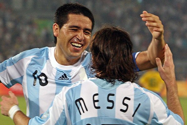 Riquelme y Messi compartieron plantel en la Selección Argentina entre 2006 y 2008. En esos años participaron de tres torneos distintos. El Mundial de Alemania 2006, dónde fue el debut de ambos en una Copa del Mundo, la Copa América 2007. Argentina se floreó hasta la final dónde cayo 3-0 con Brasil y los Juegos Olímpicos de Beijing 2008.