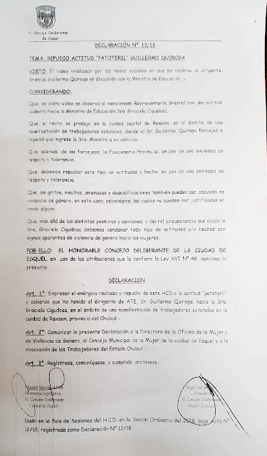 El documento, que lleva las firmas del presidente del HCD, Jorge Junyent, y la secretaria Legislativa del HCD, Mariela Sánchez Uribe, expresa: “El enérgico rechazo y repudio del Honorable Concejo Deliberante de Esquel a la actitud patoteril y cobarde que ha tenido el dirigente de ATE, Guillermo Quiroga, hacia la ministro de Educación del Chubut, Graciela Cigudosa, en el ámbito de la manifestación de trabajadores estatales en la Secretaría de Trabajo de la ciudad de Rawson”.
