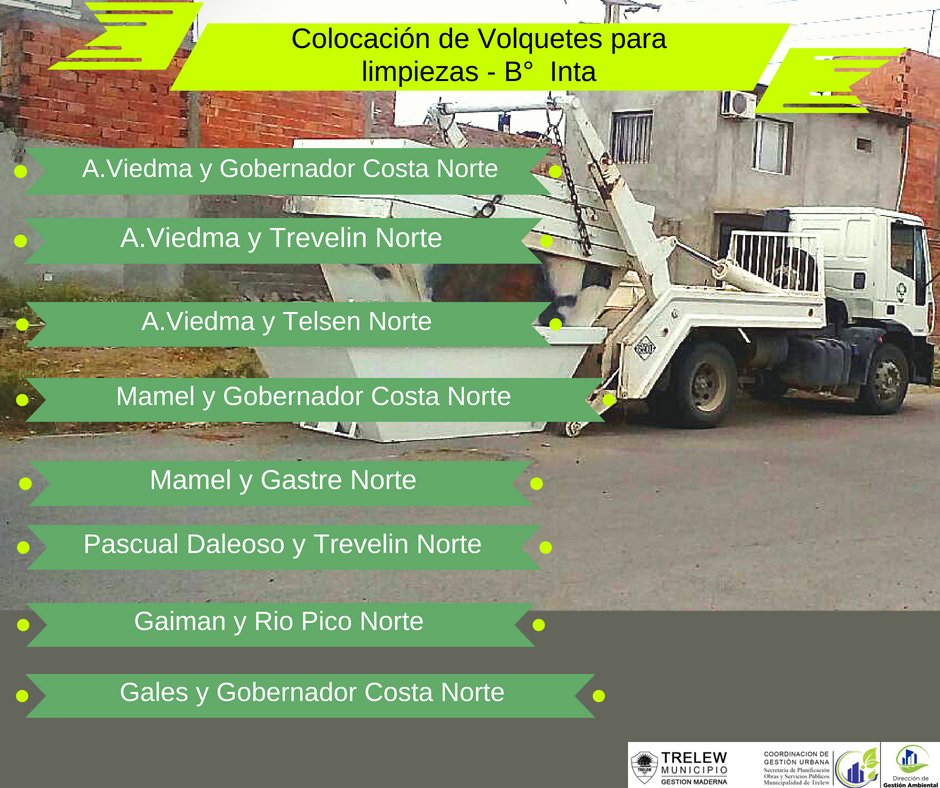 Como parte del plan de limpieza y ordenamiento urbano de la ciudad, que impulsa la Municipalidad de Trelew a través de la Coordinación de Gestión Urbana, desde el viernes 22 al lunes 25 de junio se instalarán volquetes en el barrio Inta.