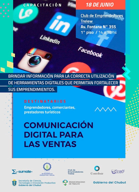 El Gobierno de la Provincia, a través la Secretaría de Ciencia, Tecnología e Innovación Productiva, junto a la Agencia de Desarrollo Productivo y Social de la Municipalidad de Trelew, dictará en esta ciudad el “Taller gratuito de Comunicación Digital para Ventas” destinado a emprendedores, comerciantes y a todo aquel interesado en conocer las herramientas digitales que sean pertinentes para mejorar las ventas.