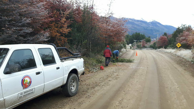Finalmente, en Alto Río Senguer el personal está haciendo podas de altura en árboles frente a la escuela provincial N°106, para minimizar el peligro de que las ramas caigan sobre el establecimiento.