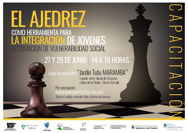 Destinado a todo el personal de los Centros Juveniles de la ciudad, así como a integrantes del COSE, y otras entidades, durante los días 27 y 29 de junio, de 14 a 19, se ofrecerá una capacitación sobre el Ajedrez como herramienta para la inclusión de los jóvenes en situación de vulnerabilidad social. Se dictará en el Jardín Tutú Marambá, organizado en forma conjunta por la Coordinación de Educación de la Municipalidad de Trelew, el gobierno provincial y el Ministerio de Desarrollo Social de la Nación.