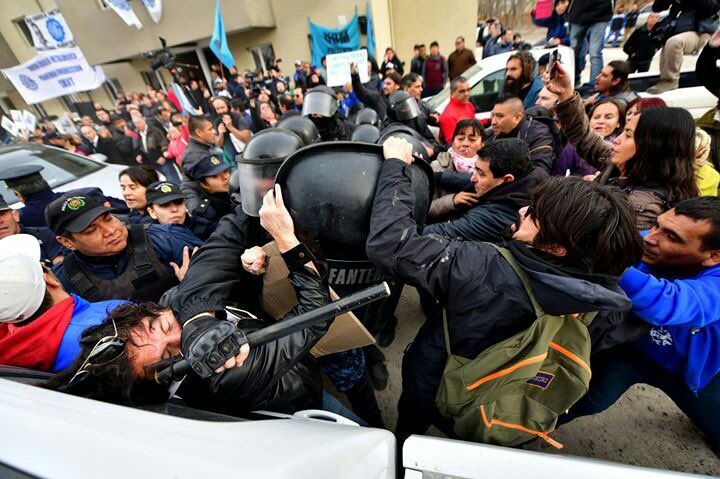 “En circunstancias que se llevaba a cabo dispositivo de seguridad, con la finalidad de realizar cobertura del acto de adjudicación de viviendas del Sindicato de Obreros Metalúrgicos, en el que se hallaban participando el Gobernador Mariano Arcioni, el Intendente Municipal Ricardo Sastre, y otros miembros del Gabinete Provincial y Municipal; se manifestó un grupo de personas identificados con pancartas y carteles como docentes, que efectuaban insultos en contra del Gobernador. En momentos en que se disponía a retirar del lugar a bordo de su vehículo oficial, el grupo de manifestantes se aglomera impidiendo el paso, por lo que se debió realizar un vallado humano policial con la finalizad de resguardar al Gobernador. Fue allí que el Subcomisario Castillo, 2do. Jefe de Comisaría, divisa que una persona de sexo masculino golpea la ventanilla del vehículo oficial, motivo por el cual lo aparta, recibiendo, de manera sorpresiva, el impacto de un elemento contundente en su brazo derecho. La persona que lanzó dicho elemento fue observado por otros efectivos policiales, los cuales, rápidamente, se dispusieron a proceder a su aprehensión. El sujeto opuso férrea resistencia, siendo finalmente reducido y trasladado a sede policial en averiguación del delito de “atentado, resistencia y lesiones a la autoridad”.