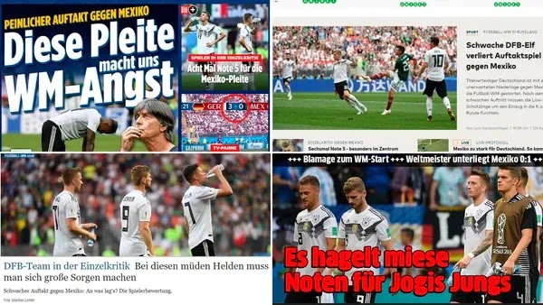 Los medios alemanes no tuvieron contemplaciones con el equipo que obtuvo el título en Brasil 2014. Y las críticas arreciaron tras la caída. Así, el periódico Bild aseguró que «Algo se rompió», luego del tropiezo frente a México.
