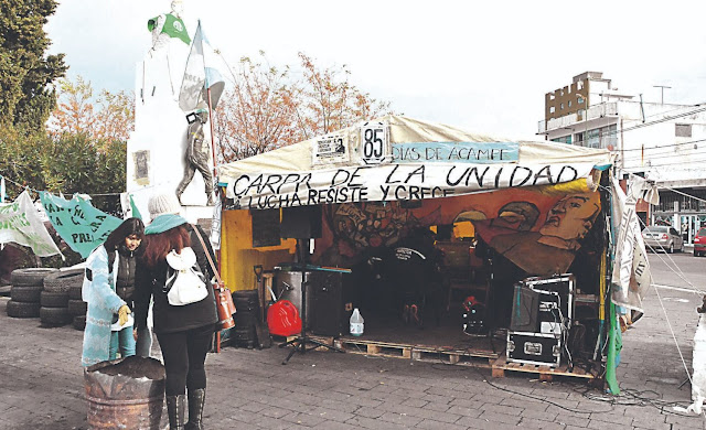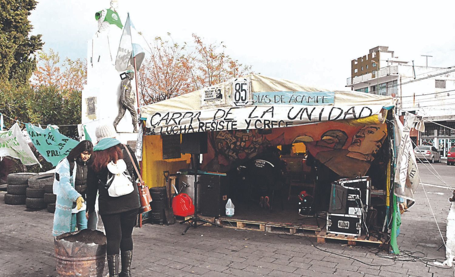La carpa de la «Unidad» cumplió ayer 85 días desde que se instaló en la Peatonal Fontana de Rawson y es sinónimo de un conflicto irresuelto que comenzó hace casi tres meses. Nunca se levantó y es el búnker principal del frente de gremios estatales.