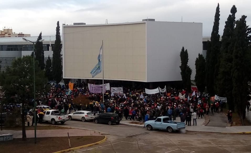 Los estatales se movilizaron este martes por las calles de Rawson hasta llegar a la Legislatura, en donde se manifiestan para reclamar la sanción de la ley de emergencia en Educación, Salud y Seguridad.