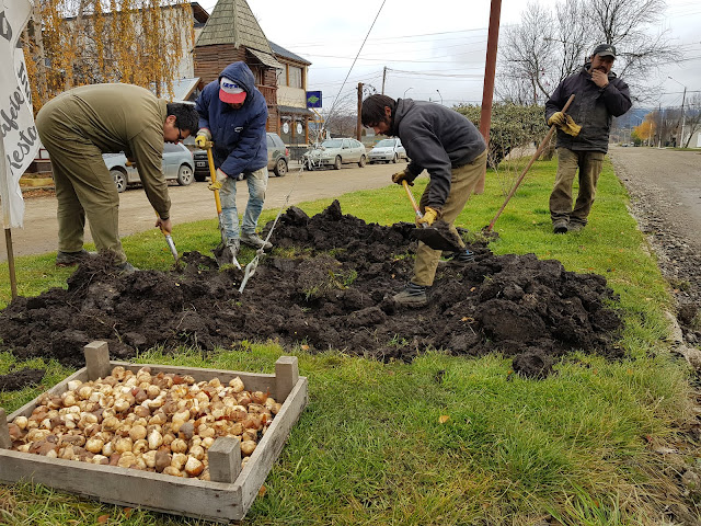 Por segundo año consecutivo, la Subsecretaría de Espacios Verdes de la Municipalidad de Trevelin, en conjunto con el productor Juan Carlos Ledesma, lleva adelante la plantación de bulbos en diferentes lugares de la localidad.