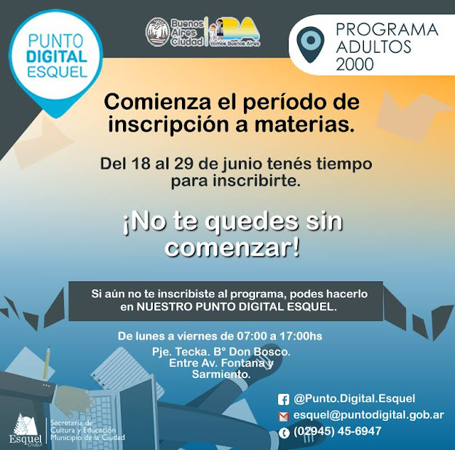 El Punto Digital Esquel, dependiente de la Secretaria Municipal de Cultura y Educación, informa a todos los alumnos del Programa de educación a distancia «Adultos 2000» que en el aula virtual ya se encuentra habilitado el link para inscribirse y cursar las materias de este nuevo trimestre.