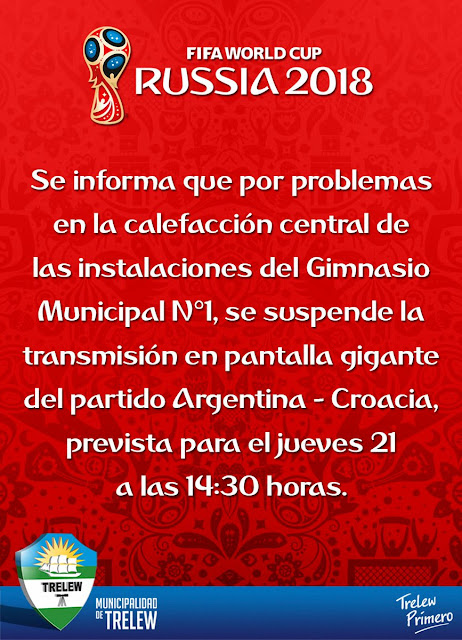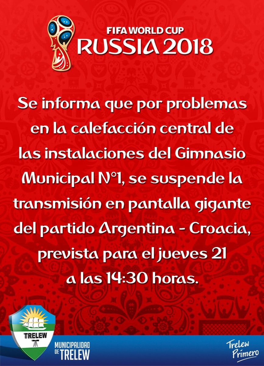 La Municipalidad de Trelew informa que ha decido suspender la transmisión del partido en pantalla gigante entre Argentina y Croacia, previsto para este jueves 21 de junio a las 14:30 horas, en el Gimnasio Municipal N° 1.