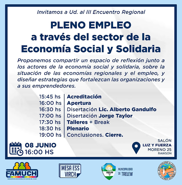Con el aporte de la Municipalidad de Trelew, a través de la Agencia de Desarrollo Productivo y Social y la Coordinación de Economía Social, junto a la Federación de Asociaciones Mutualistas de Chubut (FAMUCH), se concretará este 8 de de junio el encuentro “Pleno Empleo a través de la Economía Social y Solidaria”. El evento se desarrollará en el Salón de Luz y Fuerza, ubicado en la ciudad de Rawson, de 16 a 19 horas.