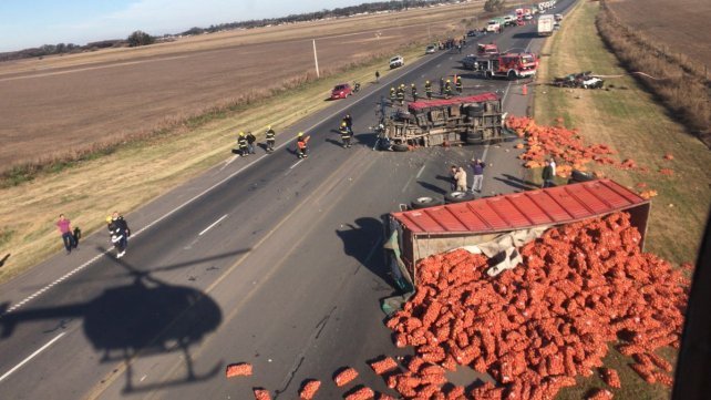 El choque fue tremendo al tal punto que el Cruze quedó destruido y el camión tumbado sobre la calzada con el cargamento de cebollas desparramado por todos lados.