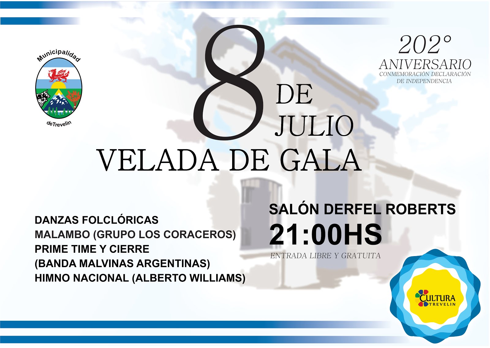 El próximo domingo 8 de julio, a las 21 en el Salón Central, se realizará la velada de gala previa al 9 de julio, organizada por la Secretaría de Cultura y Educación de la Municipalidad de Trevelin.