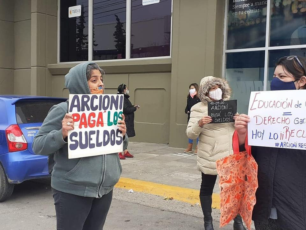 Los manifestantes estuvieron rodeados de policías y la dirigente denunció que “sabemos que nos están filmando –pero- nosotros también estamos realizando nuestras filmaciones; no estamos haciendo nada ilegal, estamos reclamando nuestro salario que incluso en el DNU de Nación se declara esta pandemia se exige el pago de salarios en tiempo y forma”.