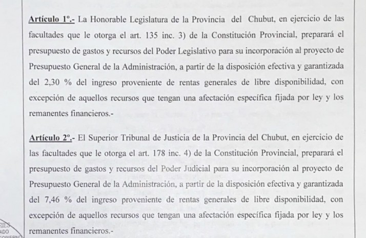 El proyecto de autarquía en sus implicaciones financieras estipula la distribución del 7,46% de los ingresos corrientes de la provincia para el Poder Judicial y el 2,30% del mismo rubro para el Poder Legislativo.