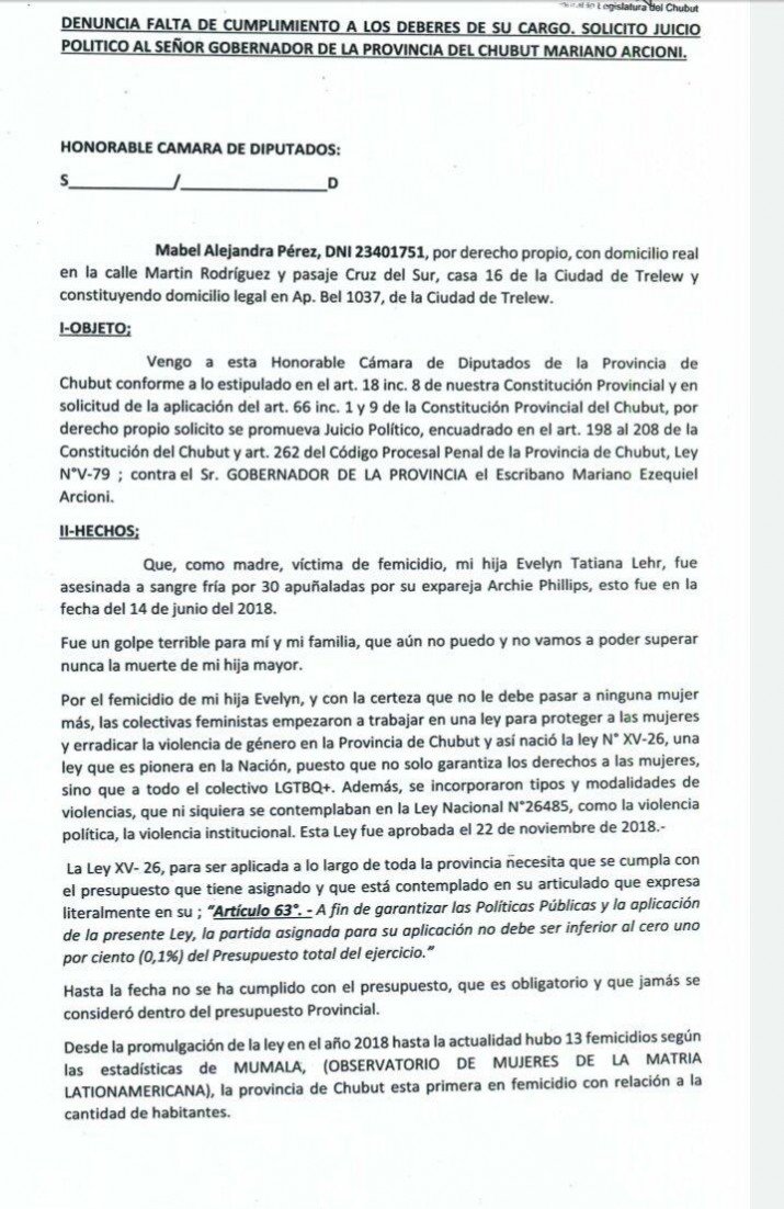 Mabel Alejandra Pérez, madre de Evelyn Lehr, presentó otro pedido de juicio político al gobernador de Chubut.