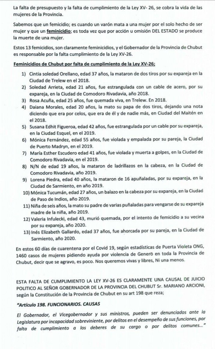 Evelyn Lehr fue asesinada con ensañamiento por Archie Phillips, y la presentación argumenta que en Chubut «no hay partidas presupuestarias para prevenir y erradicar la violencia de género según lo establecido en la Ley XV NRO. 26».