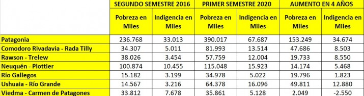En lo que respecta a la indigencia por aglomerados patagónicos Ushuaia y Río Grande el 9,8% (16.098 personas); Viedma y Carmen de Patagones acumularon el 6,2% (5.128 personas); Neuquén y Plottier con el 5,2% (15.923 personas); y Río Gallegos con el 4,1% (5.022 personas).