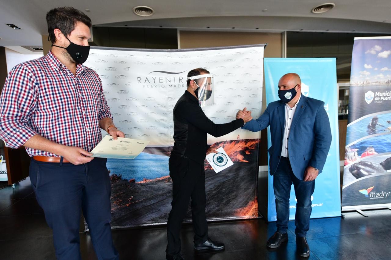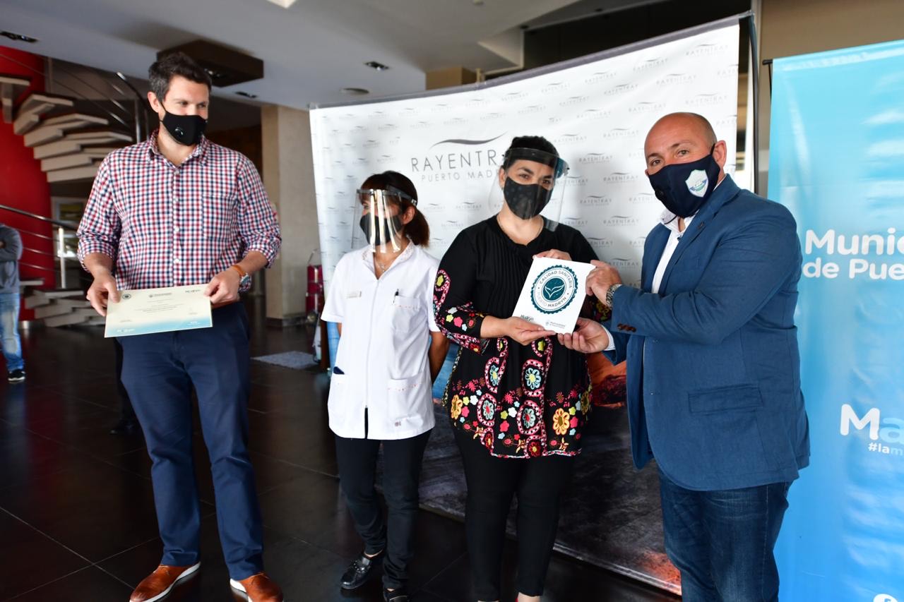 El intendente de Puerto Madryn, Gustavo Sastre, encabezó la primera entrega de las placas del Sello de Calidad Turística al Hotel Rayentray, Restaurante La Aguada y Balneario Yoaquina, que fueron los primeros prestadores en implementar distinguidas medidas sanitarias. Se trata de una propuesta impulsada por la Secretaría de Turismo Municipal para llevar adelante acciones preventivas y de concientización destinadas a optimizar los estándares de atención a turistas y residentes en el marco de la pandemia COVID-19 en establecimientos gastronómicos y alojamientos turísticos.