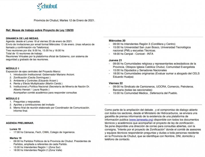 Las reuniones se realizarán de forma virtual con la coordinación de varios ministerios involucrados, además de asesores académicos que participaron en la confección del proyecto. «Representa un marco ideal para que los diputados de la provincia de Chubut puedan presenciar abiertamente de los encuentros cuya agenda se anexa a esta carta», agrega la convocatoria firmada por el ministro de Hidrocarburos, Martín Cerdá.