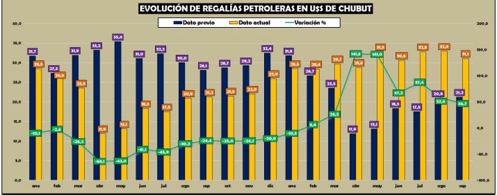 El acumulado anual hasta septiembre reflejó que las regalías traducidas a pesos que recaudó Chubut fueron 108% más elevadas que en el mismo período del 2020. De los 12.348 millones del 2020 se pasó a los 25.679 millones de este año, generándose un saldo positivo de 13.330 millones de pesos para las arcas de la provincia.