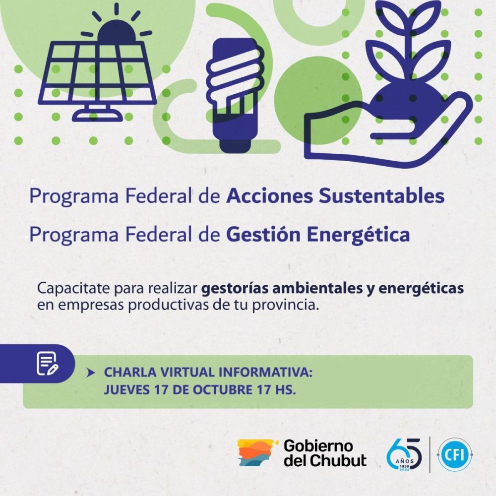 El Gobierno del Chubut, a través de la Secretaría de Infraestructura, Energía y Planificación, convoca a profesionales y expertos en materia ambiental y energética a participar de una charla virtual informativa sobre los programas federales de Acciones Sustentables para Actividades Productivas; y de Gestión Energética del Consejo Federal de Inversiones (CFI).