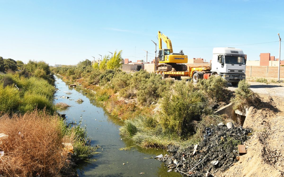 Máquinas municipales erradicaron malezas y otros residuos en el sistema de drenaje. La presencia es permanente en distintos puntos de Trelew.