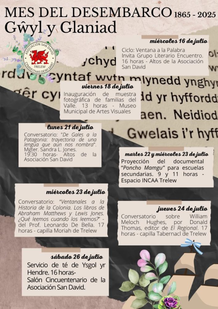 - Lunes 21 de julio (19.30 hs): charla “De Gales a la Patagonia: trayectoria de una lengua que aún nos nombra”, a cargo de la Mgter. Sandra Lubén Jones, en los Altos de San David. Entrada gratuita.