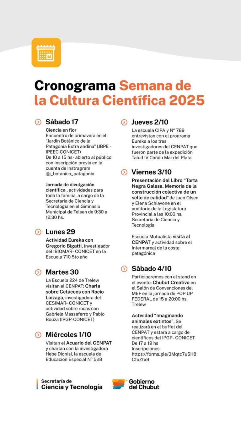 Cabe destacar que hasta el sábado 4 de octubre habrá actividades en toda la provincia en el marco de la Semana de la Cultura Científica 2025.