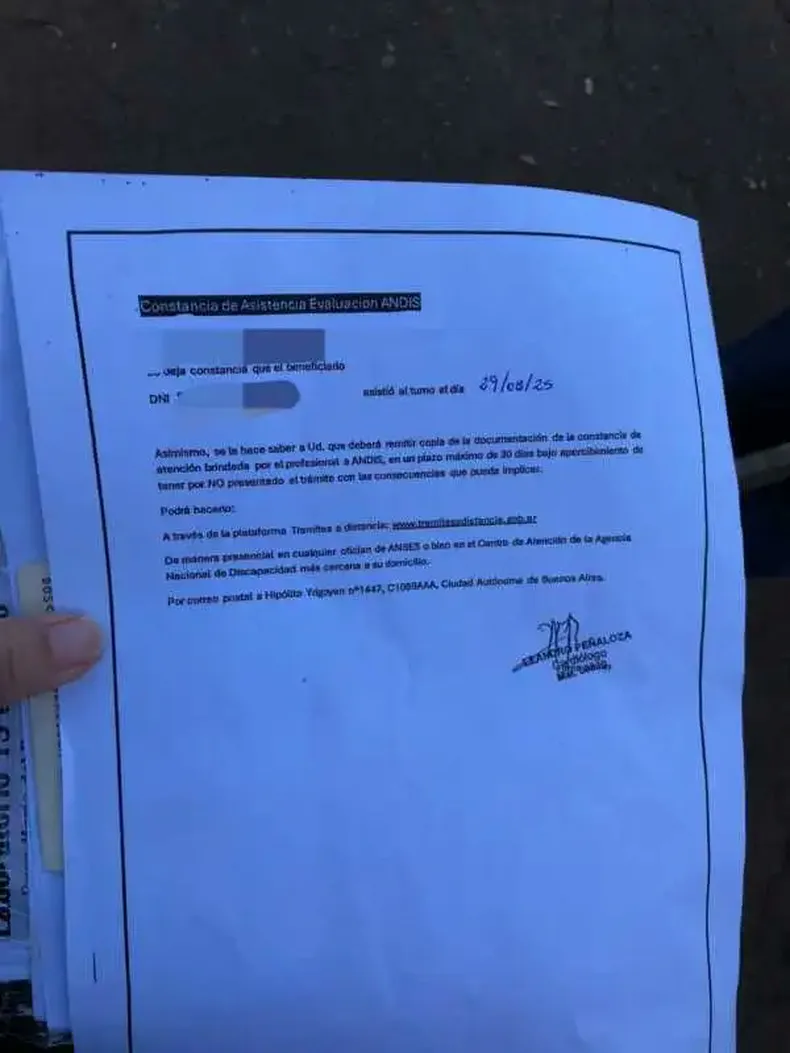 Las jornadas se desarrollaron en un restaurante abandonado, sin condiciones sanitarias ni infraestructura adecuada. Cientos de beneficiarios de pensiones por invalidez permanecieron desde la madrugada en largas filas a la intemperie. Al finalizar, recibieron un documento titulado «Constancia de Asistencia Evaluación ANDIS», sin sello ni membrete oficial, firmado con el nombre del cardiólogo Leandro Peñaloza, de Pergamino, Buenos Aires.