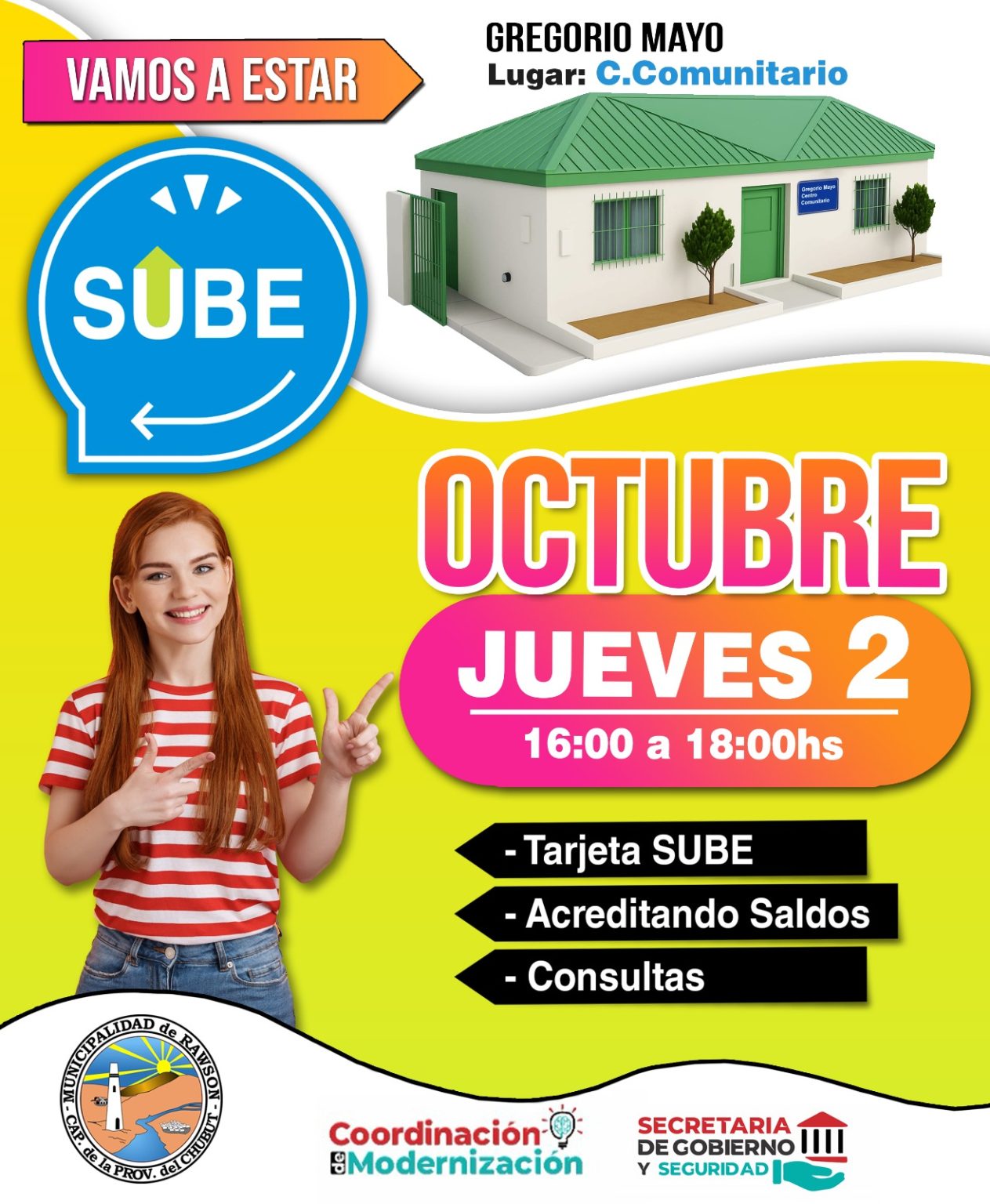 El jueves 2 de octubre, los agentes SUBE atenderán a los vecinos de Rawson y Playa Unión en el Centro Comunitario del Gregorio Mayo, de 16 a 18 horas. Durante la jornada se gestionará la entrega de nuevas tarjetas, la acreditación de saldos, la resolución de consultas y otras gestiones vinculadas al sistema, con el objetivo de simplificar los procesos y optimizar los tiempos de respuesta mediante una atención directa y eficaz.