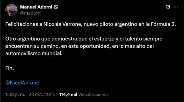 A través de su cuenta oficial en la red social X, Adorni expresó: “Felicitaciones a Nicolás Varrone, nuevo piloto argentino en la Fórmula 2. Otro argentino que demuestra que el esfuerzo y el talento siempre encuentran su camino, en esta oportunidad, en lo más alto del automovilismo mundial. Fin”.