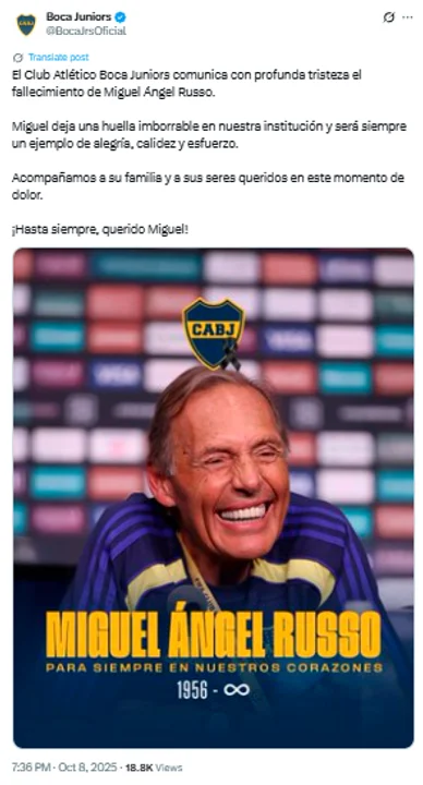 “El Club Atlético Boca Juniors comunica con profunda tristeza el fallecimiento de Miguel Ángel Russo. Miguel deja una huella imborrable en nuestra institución y será siempre un ejemplo de alegría, calidez y esfuerzo. Acompañamos a su familia y a sus seres queridos en este momento de dolor. ¡Hasta siempre, querido Miguel!”.
